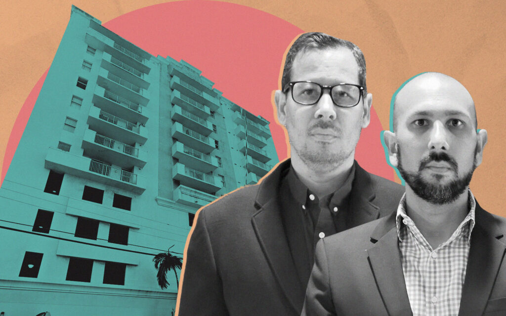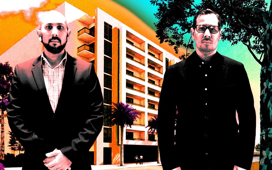 A photo illustration of Eco Stone principals Juan Gomez (right) and Javier Gomez (left) along with a rendering of Eco Landing at 1515 Northwest 18th Street (Eco Stone Group)
